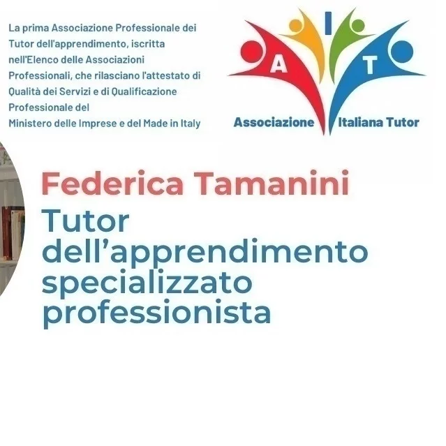 Mi chiamo Federica, sono laureata con lode in Scienze dell'Educazione. Successivamente mi sono formata e qualificata come Tutor dell'Apprendimento. Sono specializzata professionista iscritta ad AIT Associazione Italiana Tutor.