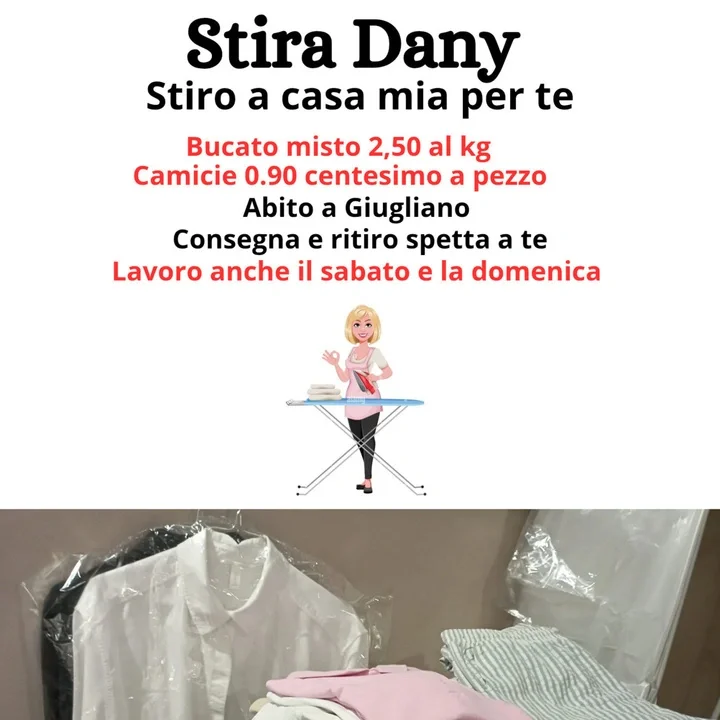 Ma chiamo Daniela, ho 42 anni, ho sempre stirato a domicilio ma da qualche tempo svolgo servizio stireria a casa mia, bucato misto 2.50€ al kg, camicie escluse 0.90 centesimi.Consegna e ritiro spetta al cliente.Il bucato verrà riconsegnato nel giro di un giorno. Naturalmente il bucato misto verrà pesato davanti a voi, a conti fatti trA grucce, buste, corrente e un po' di guadagno per me il prezzo si aggira intorno ai 7/8.00€ che potreste pagare ad una persona che viene a casa vostra.La mia convenienza è restare a casa mia per gestire meglio le mie cose, la vostra è non avere estranei in casa .Ho già un po' di clienti, tutte soddisfatte, non esitate a contattarmi, sono sempre disponibile anche il sabato e la domenica.